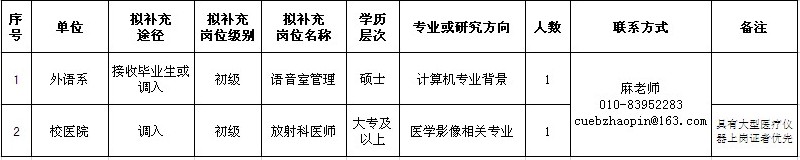 需求岗位、学历层次、所需专业、招聘人数、联系方式等相关信息请参见附表。