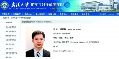 记者登录武大化院网站,找到了邓鹤翔的简历。根据简历,小邓2011年在美国加州大学洛杉矶分校取得化学博士学位,先后在该校、加州大学伯克利分校从事博士后研究。今年初,加盟武大化院,现为该院教授。