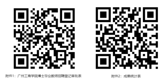 应聘者填写《广州工商学院招聘博士毕业教师登记审批表》和《博士应聘教师科研成果统计表》(扫描以下二维码下载)