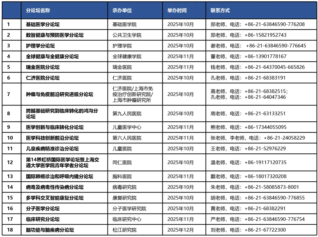 金秋十月,相约交医,第七届上海交通大学医学院国际青年学者论坛已开启报名!本届论坛设置1个主论坛与多场特色分论坛。主论坛计划于2025年10月启幕,一系列不同学科主题的分论坛将由医学院各二级学院、附属医院和学科平台陆续推出,敬请关注!论坛聚焦全球优秀青年医学创新人才,打造学术交流和人才洽谈平台,届时将汇聚交医的“大咖”们,与来自全球的青年学者共聚交医,共话医学前沿。请有意参加的青年学者不要错过!